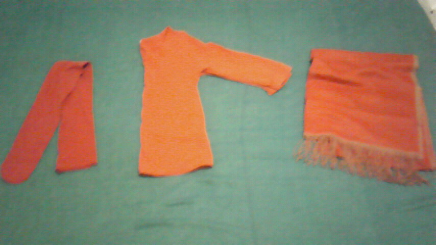 マフラーのところで、朱色の薄手の巻物が目に留まり、